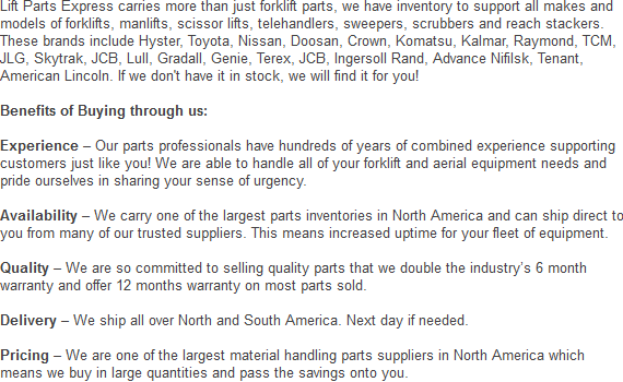 We offer you the best prices on all parts for your fleet of lift trucks. If you are interested in receiving an estimate for our parts or attachments, give us a phone call now at: